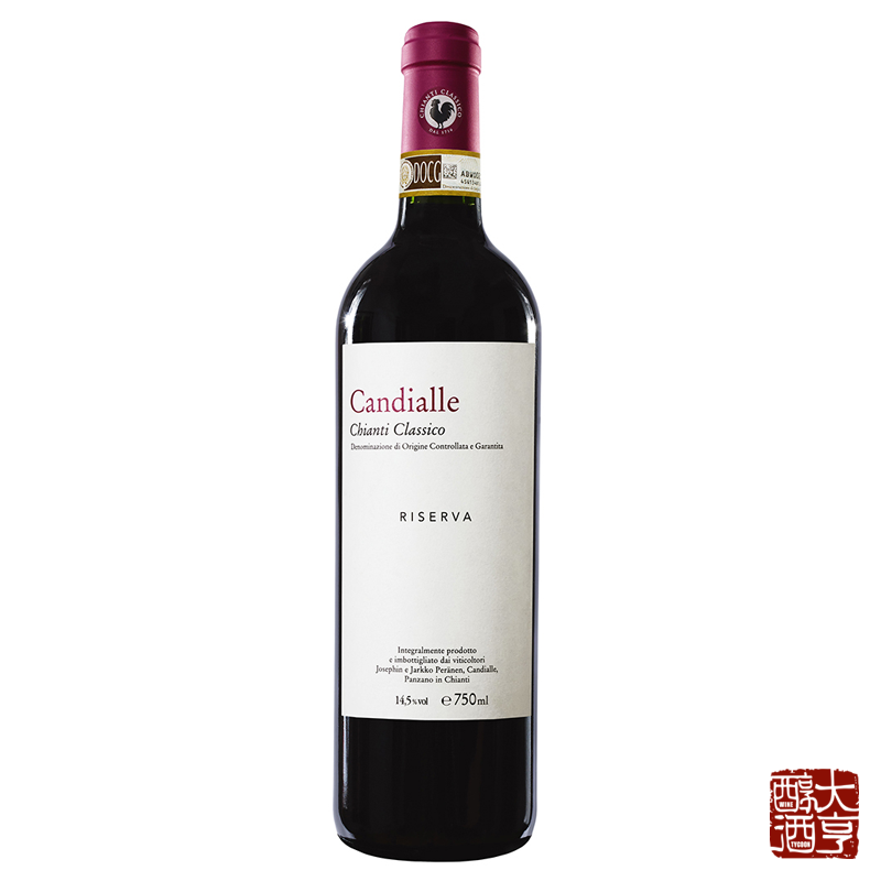 意大利 Chianti 區乾紅,Candialle的旗艦酒之一,Sangiovese葡萄,18個月 Burgundy 橡木桶陳釀。中高等酒體,散發出紅果、甜櫻桃、李子、鮮花酒香,口感豐富、圓潤、絲滑、輕巧,優雅高級,餘味悠長,極具深度。
